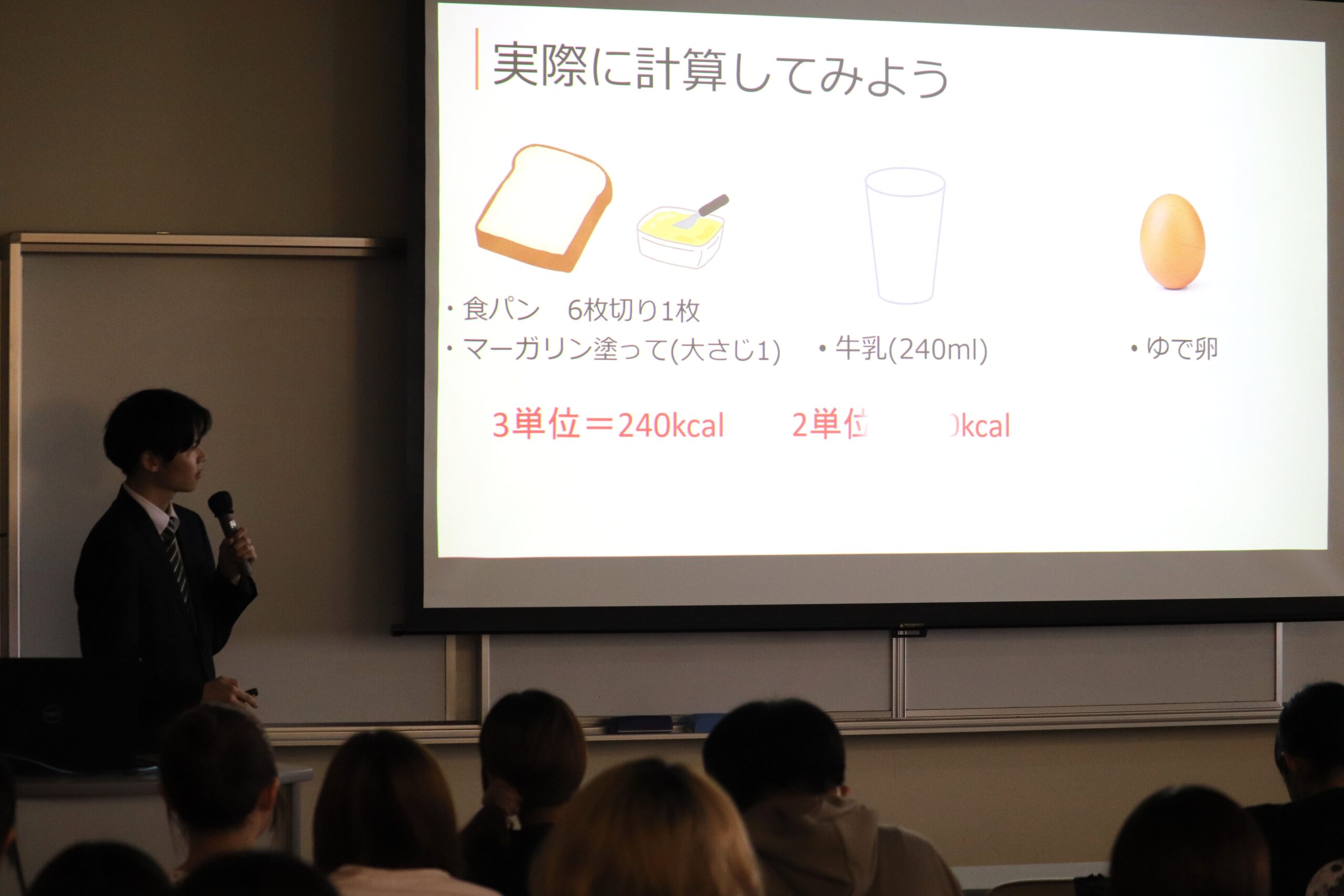 食品交換表を使ったカロリー計算も体験し,「自分でやってみると意外と難しい!」という学生の声も。