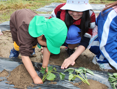 雨上がりでぬかるみを避けながらの作業。わんぱく園児さんはお尻に土のスタンプをつけていた子もいました(笑)。スコップを手に、お姉さんに教えてもらいながら作業する子どもたちの顔は真剣そのもの。 収穫の時期にはまたここで再会して、一緒にイモ掘り体験をします! 大きく育てて、子どもたちを驚かせたいですね(^^)