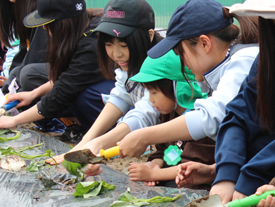 幼児教育学科1年生が、近隣の保育園の園児さんと一緒に学内の菜園にサツマイモの苗を植えました。