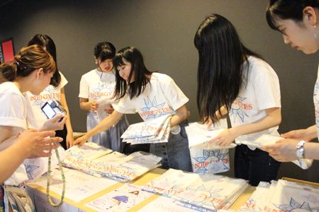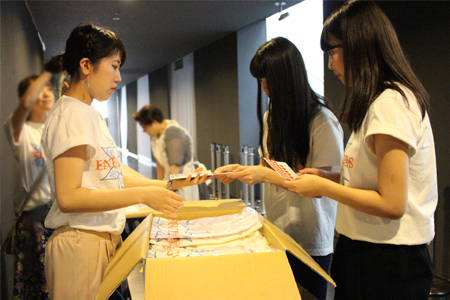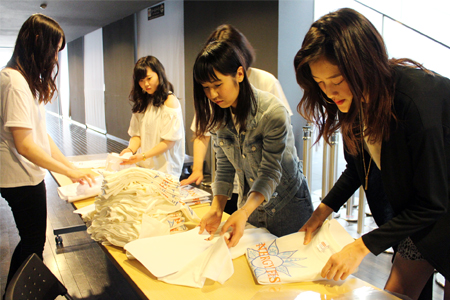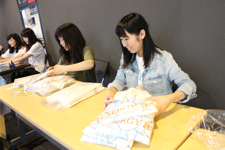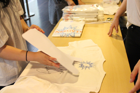販売スペースを設営後、届いたばかりのTシャツを型に合わせて丁寧に畳み、メッセージカードとともに袋詰め。