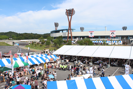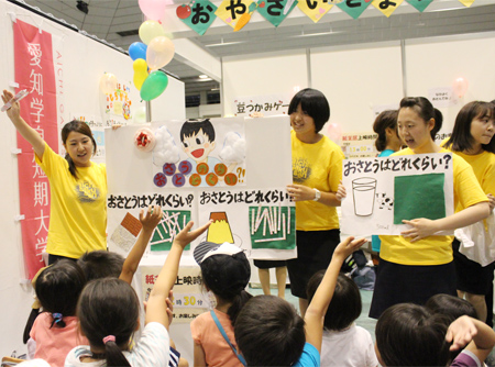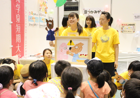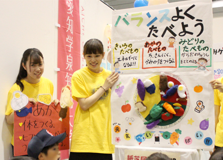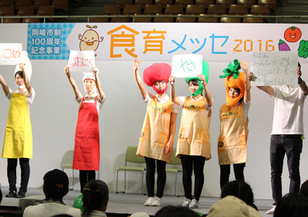 7月2日(土)、3日(日)に岡崎中央総合公園で開催された「食育メッセ2016」に食物栄養学科と大学 家政学部 管理栄養士専攻の学生が参加してきました。毎年参加させていただいているイベントですが、今年は岡崎市が7月1日に市制施行100周年を迎えることを記念して開催された「おかざき100年祭」の一環として規模を拡大して行われました。