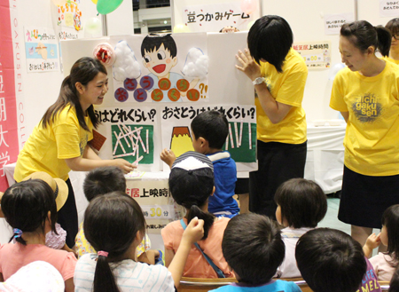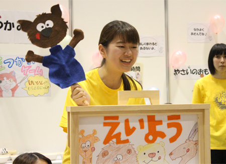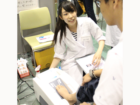 食物栄養学科は、現代までの食生活100年を振り返る食生活史のパネル展示やお子様が楽しみながら学べる食育クイズと紙芝居、幼児を持つ親への食育相談などを実施。 管理栄養士専攻は、骨密度・血管年齢の測定を実施し、骨粗しょう症・動脈硬化の予防に良いメニューを試食(数量限定)をご用意して紹介しました。ステージで食育劇も披露しました。