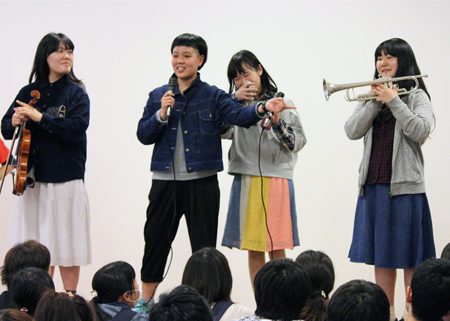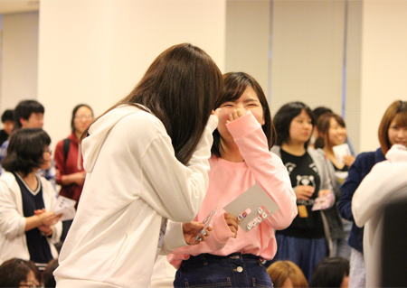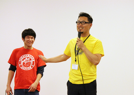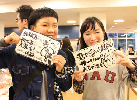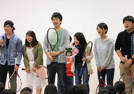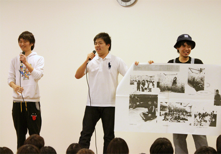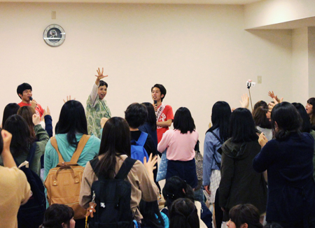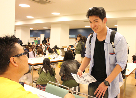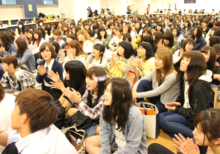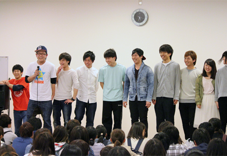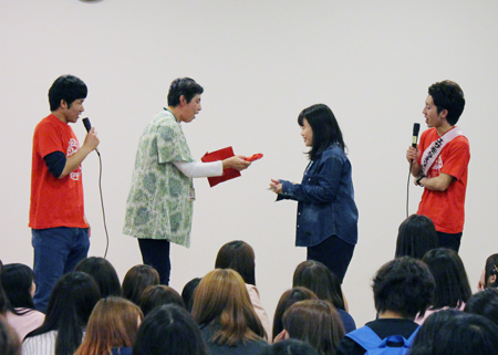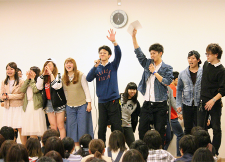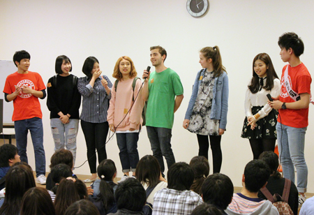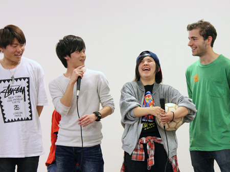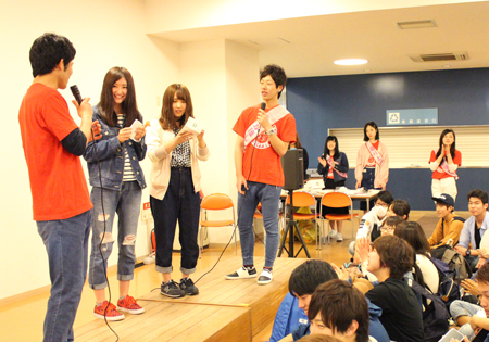 会の始めには、4月から同じキャンパスで学んでいるカナダ·カピラノ大学、韓国·烏山大学からの留学生も登壇して自己紹介をしてくれました。先日フットサルサークルに参加していた彼は、すでに溶け込んでいる様子でサークル紹介にも登場していました。
