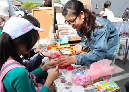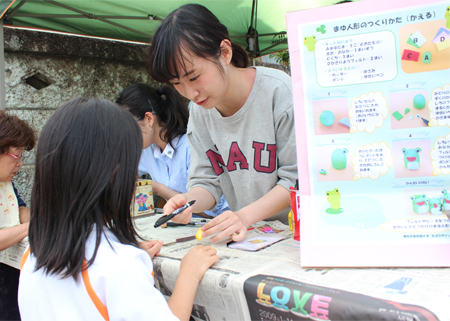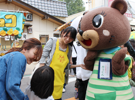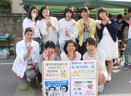 幼児教育学科はこどもまつりのマスコットキャラクター ガっくんも参加して「びゅんびゅんゴマ作り」。生活デザイン総合学科は菅瀬ゼミが「缶バッチ作り」、山本ゼミが「まゆ人形作り」のブースをそれぞれ出店。親子で参加してくださった方も多く、子どもたちは出来上がった作品を嬉しそうに手にしていました。