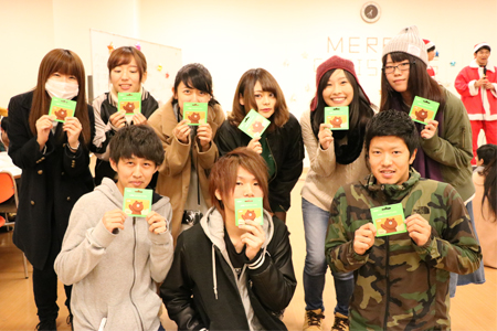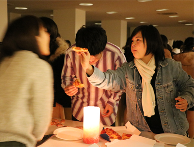 参加者は大きなピザを片手にお菓子もほおばりながら、豪華賞品をかけて真剣ゲーム対決☆。学生会長がクリスマスに欲しいプレゼントを当てるというゲームでは、1位が「愛」という答えに失笑が・・・(笑)。