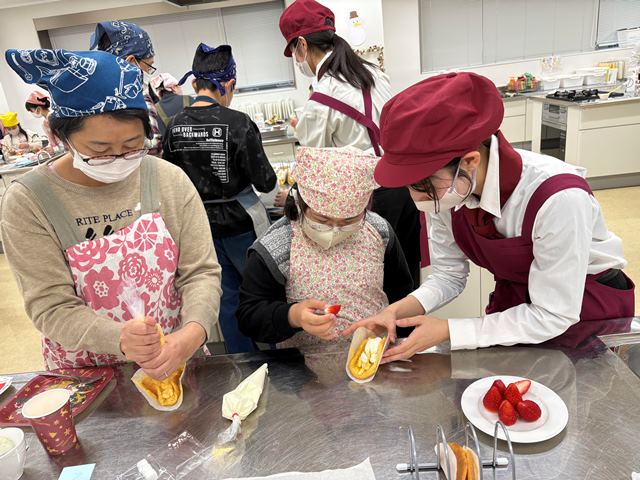 学生は、その八丁味噌をオムレット生地やクッキー生地に加える工程を丁寧に説明し、親子が一緒にスイーツづくりを楽しめるよう心がけました。